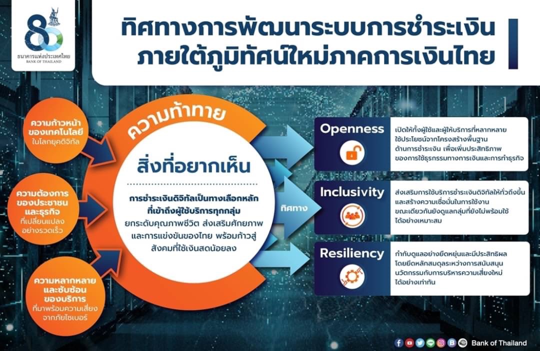 นางสาวสิริธิดา พนมวัน ณ อยุธยา ผู้ช่วยผู้ว่าการ สายนโยบายระบบการชำระเงินและเทคโนโลยีทางการเงิน ธนาคารแห่งประเทศไทย (ธปท.) เปิดเผยว่า ธปท. จัดทำ “ทิศทางการพัฒนาระบบการชำระเงินภายใต้ภูมิทัศน์ใหม่ภาคการเงินไทย” เพื่อกำหนดแผนกลยุทธ์การพัฒนาระบบชำระเงินในระยะ 3 ปี (พ.ศ. 2565 – 2567) เพื่อให้ระบบการชำระเงินทางอิเล็กทรอนิกส์ ทำหน้าที่เป็นกลไกสนับสนุนการเปลี่ยนผ่านของภาคการเงินไปสู่เศรษฐกิจดิจิทัลได้อย่างมีประสิทธิภาพและยั่งยืน โดยจะดำเนินการภายใต้ 3 หลักการ คือ การเปิดกว้างให้เกิดการใช้ประโยชน์ร่วมกัน (Openness) การเข้าถึงและเข้าใจการใช้บริการชำระเงินดิจิทัล (Inclusivity) และการกำกับดูแลที่ยืดหยุ่นและเท่าทัน (Resiliency) ภายใต้เป้าหมายที่มุ่งให้ “การชำระเงินดิจิทัลเป็นทางเลือกหลักของผู้ใช้บริการทุกกลุ่ม เพื่อยกระดับคุณภาพชีวิต ส่งเสริมศักยภาพและการแข่งขัน และให้ไทยพร้อมก้าวสู่สังคมที่ใช้เงินสดน้อยลง” ซึ่งแผนกลยุทธ์ที่สำคัญ มีดังนี้