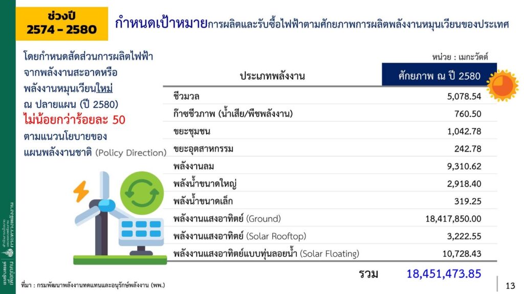 ในขณะที่กรมพัฒนาพลังงานทดแทนและอนุรักษ์พลังงาน (พพ.) เพื่อให้บรรลุเป้าหมาย ประเมินว่า ช่วงปี 2574-2580 ศักยภาพพลังงานหมุนเวียนของไทยจะมีรวม 18.45 ล้านเมกะวัตต์ .-สำนักข่าวไทย