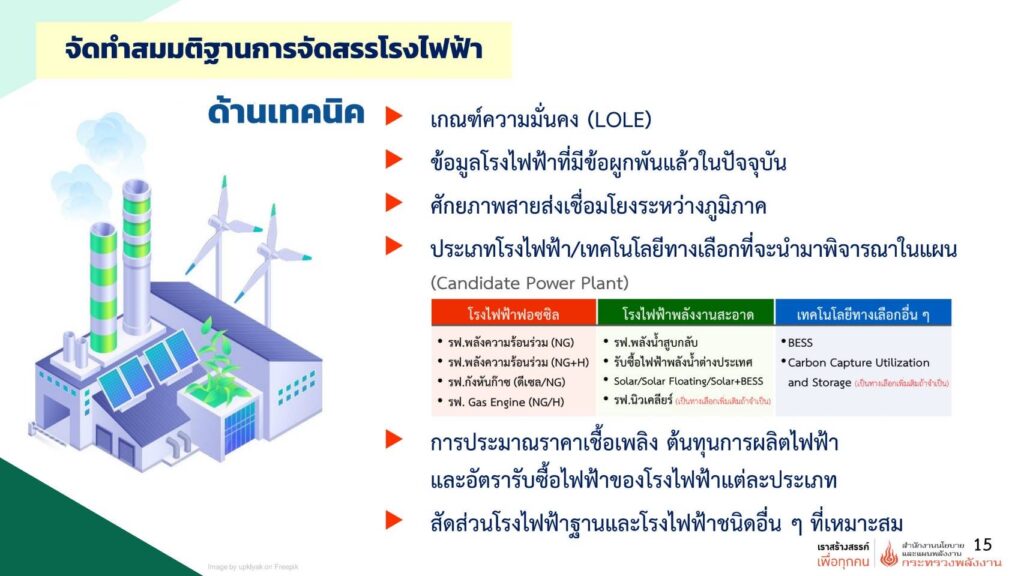ขณะที่ด้านเทคนิคได้พิจารณาเรื่องเกณฑ์ความมั่นคง (LOLE) ที่ไม่ได้คำนึงถึงสำรองไฟฟ้า แต่ดูเรื่องไฟฟ้าไม่ดับในอัตรา 0.7 วัน/ปี ข้อมูลโรงไฟฟ้าที่มีข้อผูกพันแล้วในปัจจุบัน ศักยภาพสายส่งไฟฟ้าระบบภูมิภาค ตลอดจนประเภทของโรงไฟฟ้า เทคโนโลยีทางเลือกที่จะนำมาพิจารณาในแผน เช่น โรงไฟฟ้าก๊าซฯ จะต้องมีไฮโดนเจน เข้ามาร่วมในสัดส่วนประมาณ 20% เป็นต้น