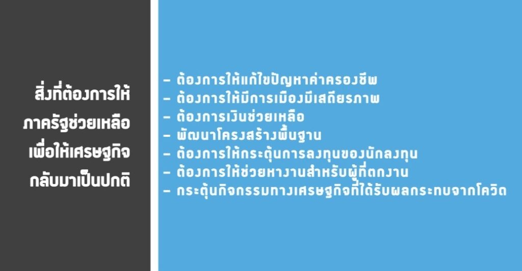 อย่างไรก็ตาม ประชาชนยังมองว่าเศรษฐกิจในปัจจุบันและอนาคต โดยเน้นการใช้จ่ายลดลงทั้งเรื่องของการท่องเที่ยวซื้อรถคันใหม่ สินค้าคงทน โดยสิ่งที่ต้องการให้ภาครัฐช่วยเหลือเพื่อให้เศรษฐกิจกลับมาเป็นปกติ คือ ต้องการให้แก้ไขปัญหาค่าครองชีพต้องการให้มีการเมืองที่มีเสถียรภาพต้องการเงินช่วยเหลือพัฒนาโครงสร้างพื้นฐานกระตุ้นการลงทุนของนักลงทุนต้องการให้ช่วยหางานสำหรับผู้ที่ตกงานและกระตุ้นกิจกรรมทางเศรษฐกิจที่ได้รับผลกระทบจากโควิดเป็นต้น.-สำนักข่าวไทย