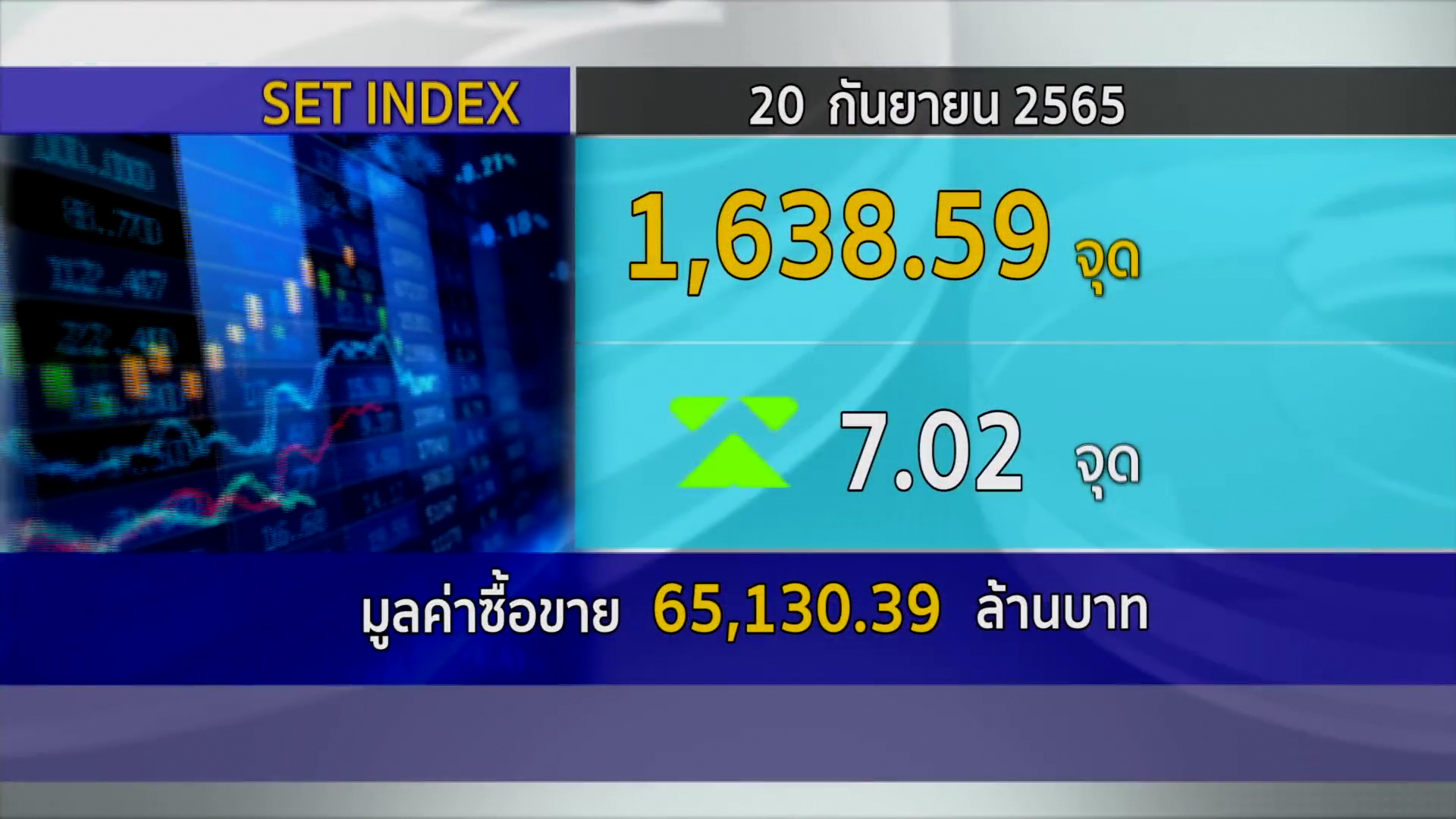 กทม. 20 ก.ย.- ตลาดหลักทรัพย์ ปิดวันนี้ที่ระดับ 1,638.59 จุด เพิ่มขึ้น 7.02 จุด (+0.43%) มูลค่าการซื้อขาย 65,130.39 ล้านบาท