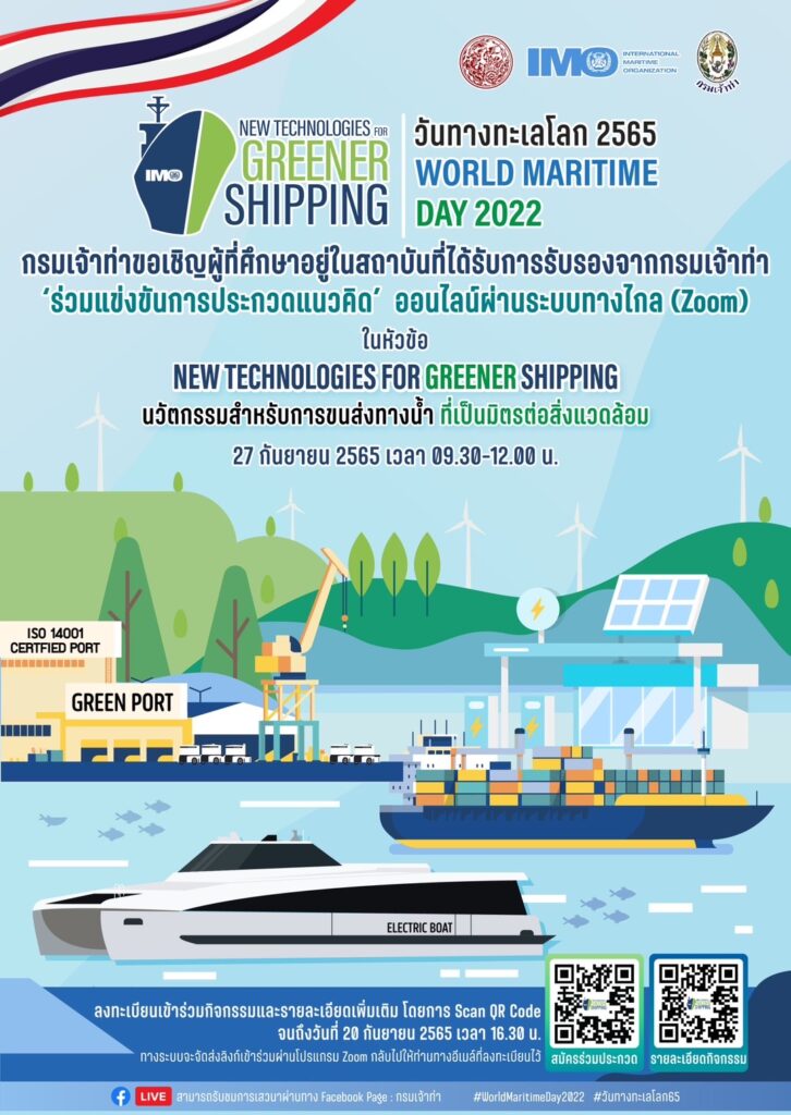 กรุงเทพฯ 20 ก.ย.- “กรมเจ้าท่า” เตรียมจัดกิจกรรมวันทางทะเลโลก ประจำปี 2565 : New technologies for greener shipping พร้อมเดินหน้า! นวัตกรรมสำหรับการขนส่งทางน้ำ ที่เป็นมิตรต่อสิ่งแวดล้อม