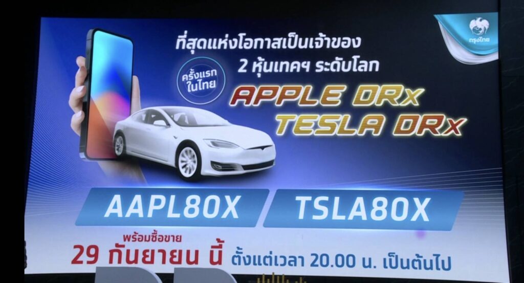 นายผยง ศรีวณิช กรรมการผู้จัดการใหญ่ ธนาคารกรุงไทย จำกัด (มหาชน) กล่าวว่า การออกและเสนอขาย DRx อ้างอิงหุ้นบริษัทชั้นนำของโลก คือ คือ บริษัท แอปเปิ้ล อิงค์ (Apple Inc) และบริษัท เทสล่า อิงค์ (Tesla Inc) ซึ่งจดทะเบียนอยู่ในตลาดหลักทรัพย์แนสแด็ก (NASDAQ) มีพื้นฐานแข็งแกร่ง มีโอกาสเติบโตสูง และเป็นที่คุ้นเคยของผู้ลงทุนไทย โดยเสนอขายให้กับนักลงทุนผ่านตลาดหลักทรัพย์แห่งประเทศไทยพร้อมกัน 2 หลักทรัพย์ คือ AAPL80X (Apple DRx) และ TSLA80X (Tesla DRx)