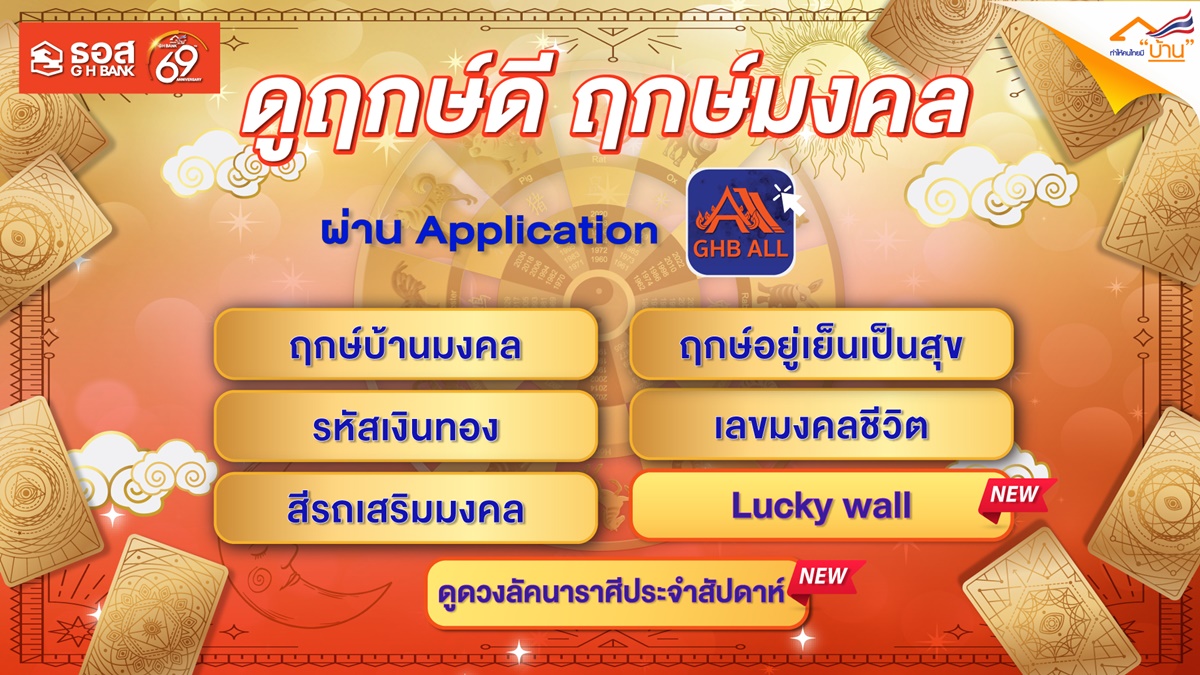 ธนาคารอาคารสงเคราะห์ (ธอส.) ฉลองครบรอบ 69 ปี เอาใจสายมูที่ต้องการเสริมความมงคลแบบฟรี ๆ ด้วยการเพิ่ม 2 บริการใหม่ เสริมดวงบน Application : GHB ALL ได้แก่ บริการ Lucky wall ที่ใช้ศาสตร์การจัดไพ่ มาผสมผสานกับการเลือกองค์เทพ 13 องค์ ซึ่งเป็นศาสตร์ของอาจารย์ชัญญา ภัคชัญญา ราชินีไพ่จิตสัมผัสชื่อดัง โดยผู้ใช้บริการสามารถนำ Lucky wall ที่ได้รับมาใช้เป็น Wallpaper เสริมดวง เพิ่มสิริมงคลให้กับชีวิตได้ และบริการดูดวงลัคนาราศีประจำสัปดาห์ กับอาจารย์วัจกร ฌาน พรหมเณศ โหราศาสตร์ชื่อดัง ซึ่ง 2 บริการดังกล่าว เป็นบริการเสริมจาก ธอส. ใน Phase 2 เพิ่มเติมจาก 5 บริการเดิมที่ได้รับความสนใจจากลูกค้าเป็นจำนวนมาก ทั้งบริการตรวจเช็กฤกษ์บ้านมงคล, ฤกษ์อยู่เย็นเป็นสุข, รหัสเงินทอง, เลขมงคลชีวิต และสีรถเสริมมงคล