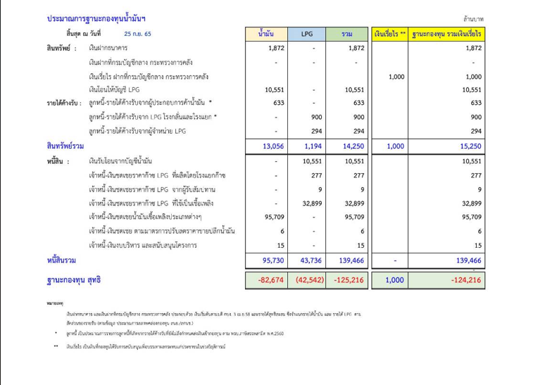 กบน. จึงเห็นชอบตรึงราคาขายปลีกน้ำมันดีเซลลิตรละ 34.94 และกองทุนน้ำมันเชื้อเพลิงเรียกเก็บเงินเข้ากองทุนน้ำมันฯ ลิตรละ 0.56 บาท ทำให้มีรายรับประเภทน้ำมันประมาณวันละ 36.42 ล้านบาท ส่วนก๊าซ LPG มีรายจ่ายประมาณวันละ 26.71 ล้านบาทต่อวันโดยเงินกองทุนน้ำมันติดลบแล้วกว่า.1.24แสนล้านบาท.-สำนักข่าวไทย