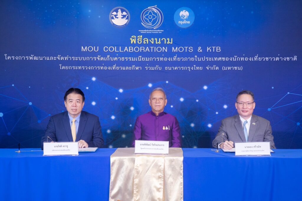 นายพิพัฒน์ รัชกิจประการ รัฐมนตรีว่าการกระทรวงการท่องเที่ยวและกีฬา ประธานและสักขีพยานในพิธี พร้อมด้วยนายโชติ ตราชู ปลัดกระทรวงการท่องเที่ยวและกีฬา และนายผยง ศรีวณิช กรรมการผู้จัดการใหญ่ ธนาคารกรุงไทย ร่วมพิธีลงนามบันทึกข้อตกลงความร่วมมือ หรือ MOU ระหว่างสำนักงานปลัดกระทรวงการท่องเที่ยวและกีฬากับธนาคารกรุงไทย ณ กระทรวงการท่องเที่ยวและกีฬา เพื่อให้บริการจัดเก็บค่าธรรมเนียมการท่องเที่ยวภายในประเทศของนักท่องเที่ยวชาวต่างชาติ รวมทั้งทำประกันภัยแก่นักท่องเที่ยวชาวต่างชาติในระหว่างท่องเที่ยวภายในประเทศ