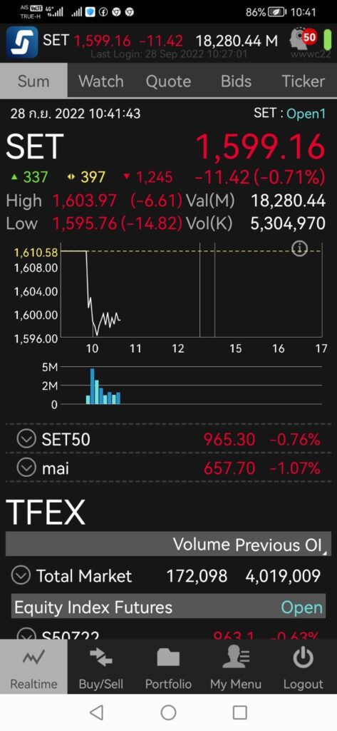 ตลาดหุ้นไทยเช้านี้ หลุด 1,600 จุด ปรับตัวลงกว่า 10 จุด ตามทิศทางเดียวกับตลาดหุ้นภูมิภาคและตลาดหุ้นดาวน์โจนส์ที่ยังปรับลงต่อเนื่องเพราะหวั่นธนาคารกลางสหรัฐขึ้น (เฟด)ดอกเบี้ยแรง และธนาคารทั่วโลกทยอยขึ้นดอกเบี้นเพื่อสกัดเงินเฟ้อ มีแรงขายหุ้นขนาดใหญ่ (Big Cap) โดยมื่อเวลา 10.41 น. ดัชนี SET มาอยู่ที่ 1,599.16 จุด ลดลง 11.42 จุด