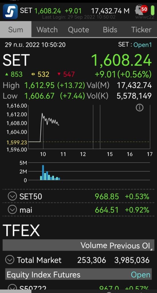 กรุงเทพฯ 29 ก.ย.-หุ้นไทยฟื้นตัวตามต่างประเทศ หลัง BoEรับซื้อพันธบัตรรัฐบาล “ศุภวุฒิ” เตือนบาทเสี่ยงอ่อนค่าหนักอีกหากนักท่องเที่ยวต่ำกว่าเป้าหมาย ตลาดหุ้นไทยภาคเช้าปรับตัวขึ้นกว่า 10 จุดตามทิศทางตลาดหุ้นในต่างประเทศ และเมื่อเวลา 10.50 น. ย่อลง ดัชนี SET มาอยู่ที่ 1,608.24 จุด ปรับขึ้น 9.01 จุด