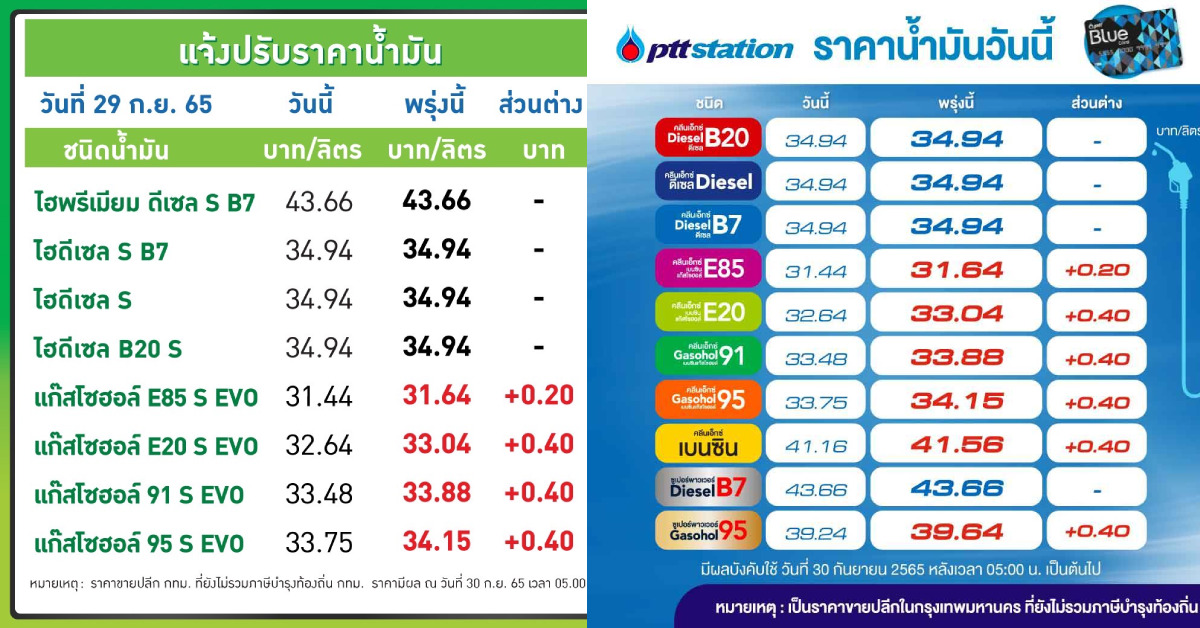 โดยราคาขายปลีกจะเป็นดังนี้ ULG = 41.56, GSH95 = 34.15, E20 = 33.04, GSH91 = 33.88, E85 = 31.64, พรีเมี่ยม GSH95 = 39.64, HSD-B7 = 34.94, HSD-B10 = 34.94, HSD-B20 = 34.94, พรีเมี่ยมดีเซล B7 = 43.66 บาทต่อลิตร โดยราคาขายปลีกข้างต้นยังไม่รวมภาษีบำรุงกรุงเทพมหานคร