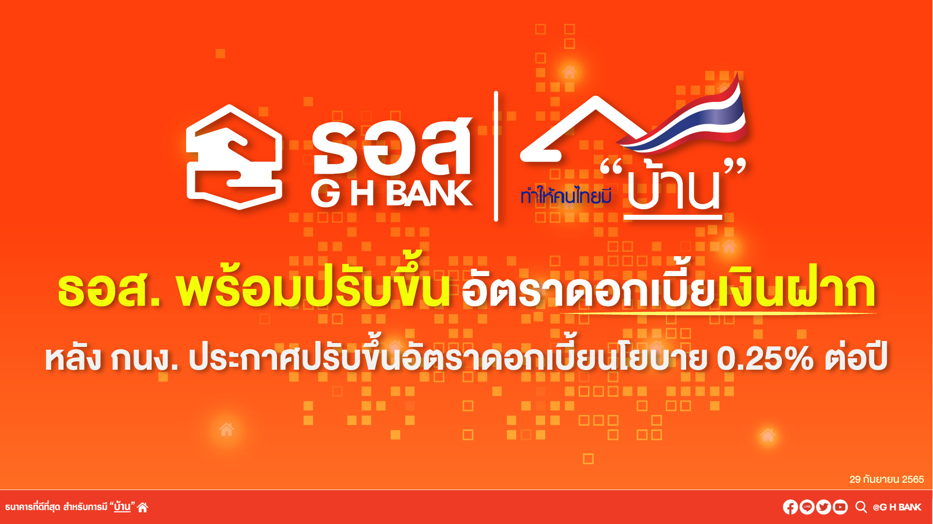 ทั้งนี้ การเตรียมปรับขึ้นอัตราดอกเบี้ยเงินฝากดังกล่าวของ ธอส. มีขึ้นภายหลังจากที่ประชุมคณะกรรมการนโยบายการเงิน (กนง.) เมื่อวันที่ 28 สิงหาคม 2565 มีมติให้ปรับขึ้นอัตราดอกเบี้ยนโยบาย 0.25% ต่อปี หรือจาก 0.75% ต่อปี เป็น 1.00% ต่อปี ขณะที่อัตราดอกเบี้ยเงินกู้นั้น ธอส. ยืนยันว่าจะยังคงไว้ระดับเดิมถึงสิ้นปี 2565 เป็นอย่างน้อย. – สำนักข่าวไทย