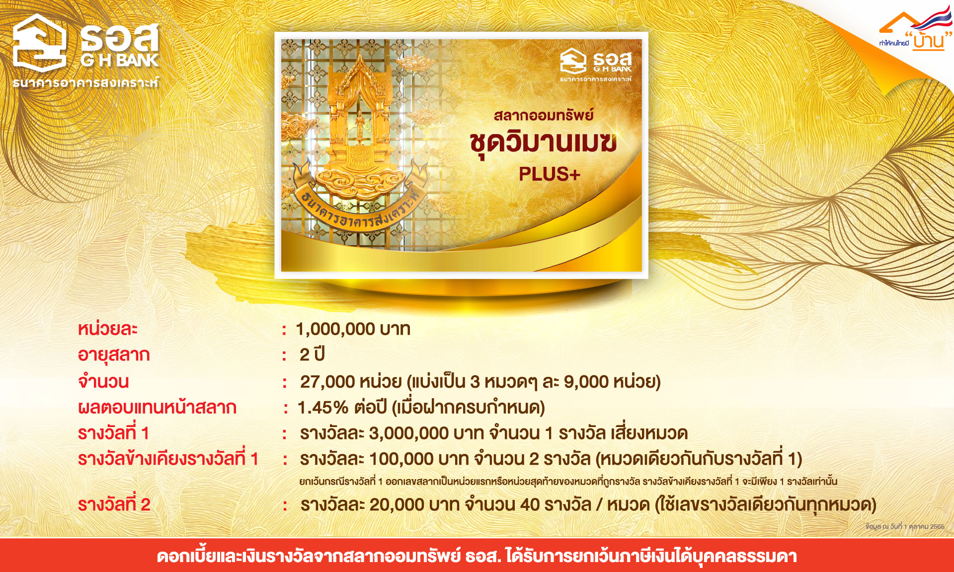นายฉัตรชัย ศิริไล กรรมการผู้จัดการ ธนาคารอาคารสงเคราะห์ (ธอส.) เปิดเผยว่า เพื่อเพิ่มทางเลือกให้กับประชาชนที่ต้องการออมเงินและลงทุนกับผลิตภัณฑ์ทางการเงินที่ให้ผลตอบแทนสูง สอดคล้องกับที่คณะกรรมการนโยบายการเงิน (กนง.) ปรับขึ้นอัตราดอกเบี้ยนโยบายเป็น 1.00% ต่อปี ล่าสุด ธอส. จึงได้จัดทำผลิตภัณฑ์สลากออมทรัพย์ ธอส. ชุดวิมานเมฆ Plus สลากออมทรัพย์พรีเมียมหน่วยละ 1 ล้านบาท จำนวน 27,000 หน่วย (แบ่งเป็น 3 หมวดๆ ละ 9,000 หน่วย) กรอบวงเงินรวม 27,000 ล้านบาท อายุสลาก 2 ปี เมื่อฝากครบกำหนดรับผลตอบแทนหน้าสลาก 1.45% ต่อปี โดยจะได้รับเงินต้นพร้อมดอกเบี้ยรวมหน่วยละ 1,029,000 บาท อีกทั้งยังมีสิทธิลุ้นรางวัลทุกวันที่ 16 ของเดือน รวม 24 งวด โดยรางวัลที่ 1 มูลค่ารางวัลสูงถึงรางวัลละ 3 ล้านบาท จำนวน 1 รางวัล (เสี่ยงหมวด) รางวัลข้างเคียงรางวัลที่ 1 รางวัลละ 100,000 บาท จำนวน 2 รางวัล (หมวดเดียวกับรางวัลที่ 1) และรางวัลที่ 2 รางวัลละ 20,000 บาท จำนวน 40 รางวัล/หมวด คิดเป็นโอกาสในการถูกรางวัลสูงถึง 0.4444% และยังได้รับการยกเว้นภาษีเงินได้บุคคลธรรมดาสำหรับดอกเบี้ยและเงินรางวัลอีกด้วย