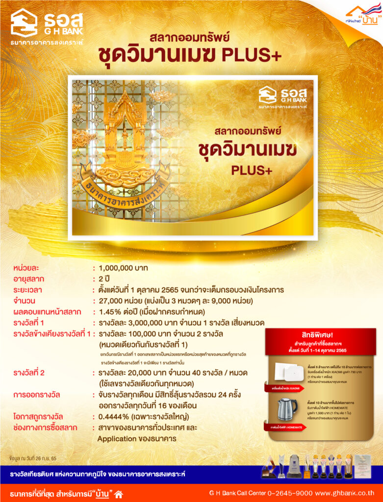 ธนาคารอาคารสงเคราะห์ เปิดตัวสลากออมทรัพย์ชุดใหม่ รองรับประชาชนที่ต้องการออมเงินในช่วงดอกเบี้ยมีแนวโน้มสูงขึ้น และทดแทนสลากออมทรัพย์ชุดวิมานเมฆ สลากออมทรัพย์ชุดแรกของธนาคารที่จะครบกำหนดไถ่ถอนในช่วงเดือนตุลาคมนี้ ด้วยสลากออมทรัพย์ ธอส. ชุด “วิมานเมฆ Plus” หน่วยละ 1 ล้านบาท กรอบวงเงินรวม 27,000 ล้านบาท อายุสลาก 2 ปี ผลตอบแทนหน้าสลาก 1.45% ต่อปี ลุ้นรับรางวัลที่ 1 มูลค่าสูงถึง 3 ล้านบาท เริ่มรับฝากตั้งแต่วันเสาร์ที่ 1 ตุลาคม 2565 และออกรางวัลครั้งแรกวันอาทิตย์ที่ 16 ตุลาคม 2565