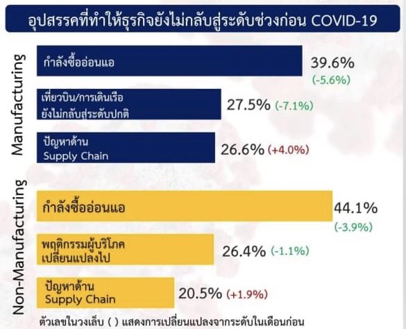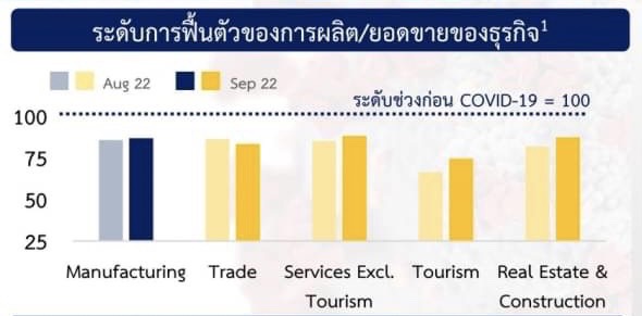 ขณะที่ ผลกระทบจากโควิด-19 ต่อภาคธุรกิจไทย เดือน ก.ย. 2565 ซึ่ง ธปท. จัดทำร่วมกับสมาคมผู้ค้าปลีกไทย โดยสำรวจผู้ประกอบการรายใหญ่และเอสเอ็มอี ระหว่างวันที่ 1- 26 กันยายน 2565 จำนวน 442 ราย พบว่าการฟื้นตัวของธุรกิจปรับดีขึ้นเมื่อเทียบกับเดือนก่อน แต่กำลังซื้อที่อ่อนแอยังคงเป็นอุปสรรคสำคัญที่สุดที่กดดันการฟื้นตัวของธุรกิจในภาพรวม โดยภาคการผลิตมีความกังวลต่อปัญหาด้าน Supply Chain เพิ่มขึ้น ส่วนการฟื้นตัวของการจ้างงานในภาพรวมปรับดีขึ้นจากภาคที่มิใช่การผลิตเป็นสำคัญ