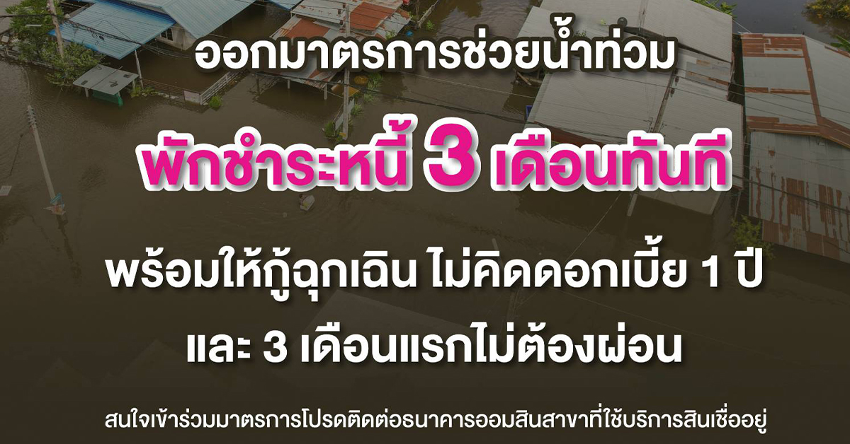 ขณะเดียวกัน ธนาคารฯ ยังให้ประชาชนที่ประสบภัยกู้เงินฉุกเฉิน สินเชื่อเพื่อช่วยเหลือผู้ประสบภัยพิบัติ เพื่อบรรเทาความเดือดร้อนจากเหตุน้ำท่วม/ภัยพิบัติ รายละไม่เกิน 50,000 บาท ไม่คิดดอกเบี้ยในปีแรก หลังจากนั้นคิดดอกเบี้ยเพียงร้อยละ 0.85 ต่อเดือน (Flat Rate) ชำระเงินเป็นรายเดือน 3-5 ปี โดยปลอดชำระเงินงวด 3 เดือนแรก