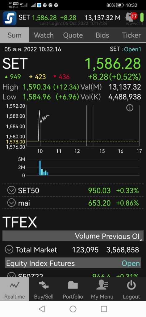 กรุงเทพฯ 5 ต.ค.-หุ้นไทยบวกต่อ บล.โนมูระ พัฒนสิน แนะเพิ่มลงทุน เน้นกลุ่มบริโภคในประเทศ ตลาดหุ้นไทย ภาคเช้าเปิดตลาดปรับตัวขึ้นกว่า 10 จุดเมื่อเวลา 10.32 น. ดัชนี SET มาอยู่ที่ 1,586.20 จุด เพิ่มขึ้น 8.28 บาท (+0.52%)