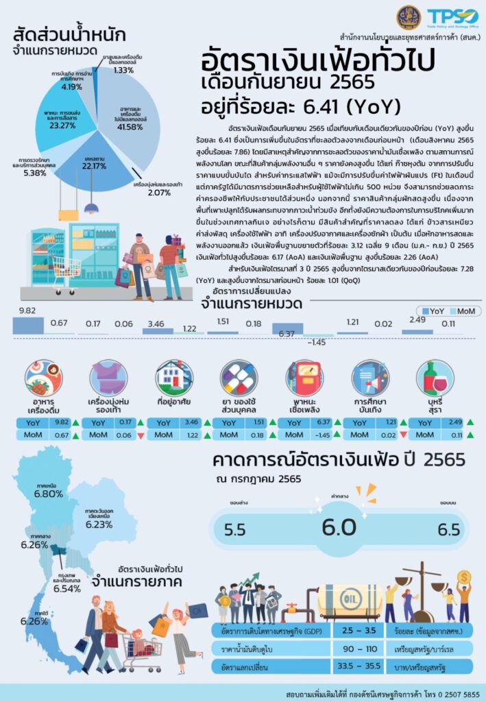 นายพูนพงษ์ นัยนาภากรณ์ รองปลัดกระทรวงพาณิชย์กล่าวว่า สำนักงานนโยบายและยุทธศาสตร์การค้า หรือ สนค.รายงานดัชนีราคาผู้บริโภคของไทย เดือนกันยายน 2565 เท่ากับ 107.70 เมื่อเทียบกับเดือนเดียวกันของปีก่อน ซึ่งเท่ากับ 101.21 ส่งผลให้อัตราเงินเฟ้อทั่วไปอยู่ที่ร้อยละ 6.41 ชะลอตัวลงจากเดือนสิงหาคม 2565 ที่สูงขึ้นร้อยละ 7.86 ตามการชะลอตัวของราคาสินค้าในกลุ่มพลังงาน เคหสถาน และเครื่องประกอบอาหาร ประกอบกับฐานดัชนีราคาฯ ที่ใช้คำนวณเงินเฟ้อในเดือนเดียวกันของปีก่อนอยู่ระดับสูง อย่างไรก็ตาม ในเดือนนี้ราคาสินค้าและบริการโดยรวมยังคงสูงกว่าเดือนเดียวกันของปีที่ผ่านมา จากการทยอยปรับราคาเพิ่มตามต้นทุนในช่วงก่อนหน้า พื้นที่การเกษตรได้รับความเสียหายจากน้ำท่วมขัง และอุปสงค์ในประเทศที่ปรับตัวดีขึ้น ซึ่งมีส่วนทำให้เงินเฟ้อยังคงขยายตัว แต่ในอัตราที่ชะลอตัวตามที่คาดการณ์