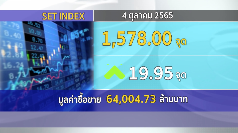 กทม. 4 ต.ค.- ตลาดหลักทรัพย์ ปิดวันนี้ที่ระดับ 1,578.00 จุด เพิ่มขึ้น 19.95 จุด (+1.28%) มูลค่าการซื้อขาย 64,004.73 ล้านบาท