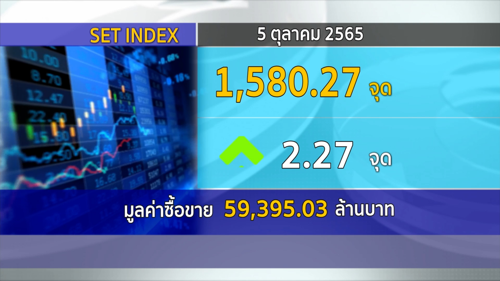 กทม. 5 ต.ค.- ตลาดหลักทรัพย์ ปิดวันนี้ที่ระดับ 1,580.27 จุด เพิ่มขึ้น 2.27 จุด (+0.14%) มูลค่าการซื้อขาย 59,395.03 ล้านบาท