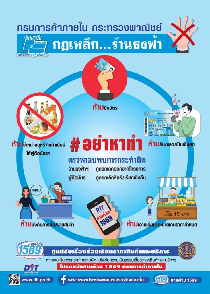 ทั้งนี้ กรมการค้าภายในจึงได้มีการส่งเจ้าหน้าที่ตรวจสอบอย่างต่อเนื่องเพื่อป้องกันมิให้ประชาชนถูกเอาเปรียบ พร้อมลงพื้นที่แจกสื่อประชาสัมพันธ์เรื่อง ‘5 กฎเหล็กข้อห้ามร้านธงฟ้า’ 1.ห้ามจำหน่ายบุหรี่/สุรา/เบียร์ให้แก่ผู้ถือบัตร 2.ห้ามยึดบัตรสวัสดิการแห่งรัฐ 3.ห้ามรับ/แลกเป็นเงินสด 4.ห้ามเอาเปรียบฉวยโอกาสปรับขึ้นราคาและขายเกินราคาที่กำหนดโดยเด็ดขาด 5.ห้ามบังคับการซื้อ/ขายสินค้า เพื่อเป็นข้อปฏิบัติที่ควรพึงระวัง หากร้านธงฟ้าทำผิดจะได้รับบทลงโทษทันที