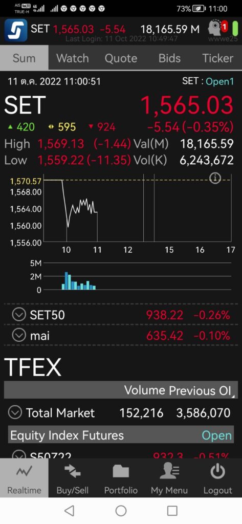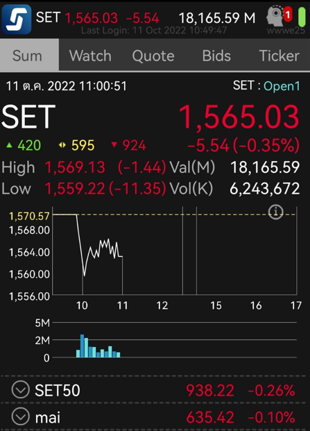 ตลาดหุ้นไทยภาคเช้าปรับตัวลงกว่า 10 จุดและเมื่อเวลา 11.00 น. ดัชนี SET มาอยู่ที่ 1,565 จุด ลดลง 5.54 จุด เคลื่อนไหวตามทิศทางตลาดหุ้นต่างประเทศกังวลเศรษฐกิจชะลอตัวและธนาคารกลางสหรัฐ (เฟด) เดินหน้าจะเร่งปรับขึ้นดอกเบี้ย.-สำนักข่าวไทย