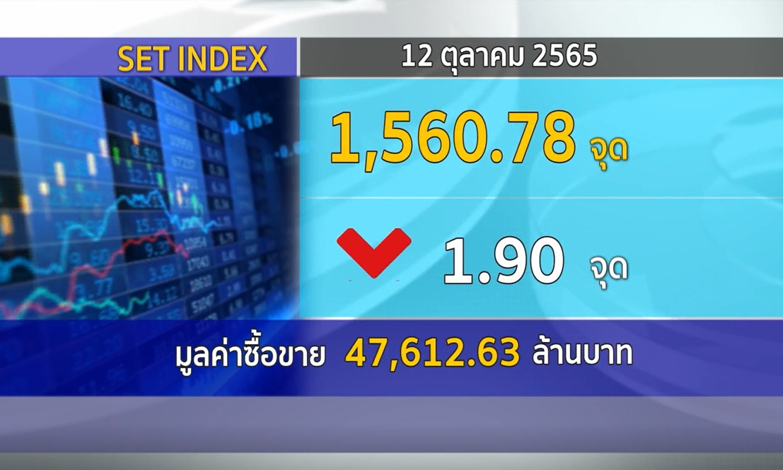 กทม. 12 ต.ค.-ตลาดหลักทรัพย์ ปิดวันนี้ที่ระดับ 1,560.78 ลดลง 1.90 จุด (-0.12%) มูลค่าการซื้อขาย 47,612.63 ล้านบาท
