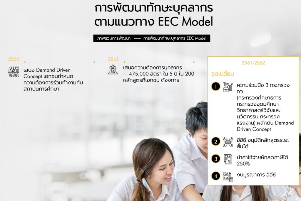 น.ส.ทิพานัน ศิริชนะ รองโฆษกประจำสำนักนายกรัฐมนตรี เปิดเผยว่า รัฐบาลได้มีการผลักดันโครงการพัฒนาเศรษฐกิจพิเศษภาคตะวันออก หรือ EEC อย่างจริงจัง ยกระดับความสามารถในการแข่งขันของภาคการผลิตและภาคบริการ บนฐานของเทคโนโลยีสมัยใหม่ และนวัตกรรม ทั้งนี้ได้มีการเตรียมกำลังคนเพื่อทำงานในพื้นที่ EEC โดยสถาบันการศึกษาผลิตคน เน้นที่ศักยภาพตามความต้องการของสถานประกอบการ (Demand Driven) เพื่อให้เยาวชนและประชาชนมีงานทำ มีรายได้สูงด้วยความสามารถ ซึ่งเริ่มดำเนินการมาตั้งแต่ ปี พ.ศ. 2561