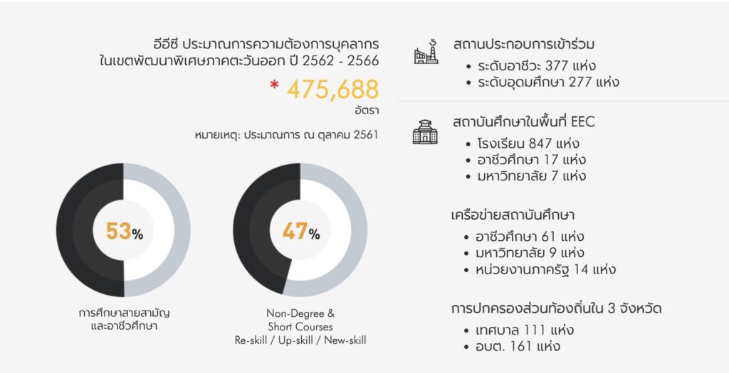 ในเบื้องต้นประมาณการความต้องการบุคลากรในพื้นที่ EEC อยู่ที่ 475,688 อัตรา อาทิ อุตสาหกรรมท่องเที่ยวกลุ่มรายได้ดี และท่องเที่ยวเชิงสุขภาพ 16,920 ตำแหน่ง, อุตสาหกรรมหุ่นยนต์ 37,526 ตำแหน่ง, อุตสาหกรรมดิจิทัล 116,222 ตำแหน่ง, อุตสาหกรรมอิเล็กทรอนิกส์อัจฉริยะ 58,228 ตำแหน่ง,อุตสาหกรรมการแพทย์ครบวงจร 11,538 ตำแหน่ง, อุตสาหกรรมพาณิชย์นาวี 14,630 ตำแหน่ง,อุตสาหกรรมยานยนต์แห่งอนาคต 53,738 ตำแหน่ง, อุตสาหกรรมการบินและโลจิสติกส์ 166,992 ตำแหน่ง โดยแบ่งเป็น ระดับอาชีวศึกษา 253,114 ตำแหน่ง ระดับปริญญาตรี 214,070 ตำแหน่ง และระดับปริญญาโทร-เอก 8,610 ตำแหน่ง