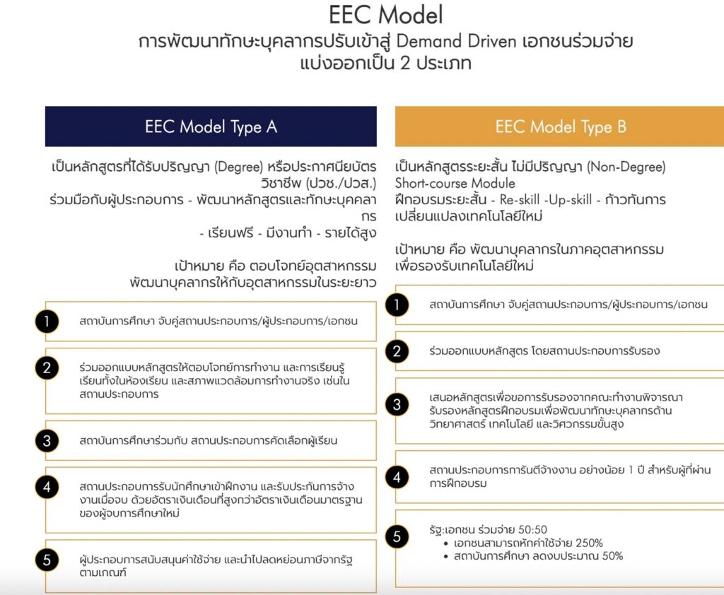 น.ส.ทิพานัน กล่าวว่า รัฐบาลโดย พล.อ ประยุทธ์ จันทร์โอชา ได้วางแนวทางเรื่องการพัฒนาบุคลากรให้ตรงความต้องการไว้แล้ว โดยแบ่งออกเป็น 2 แบบ ได้แก่ 1. EEC Model Type A ให้สถานศึกษาจัดการศึกษาหลักสูตร ที่ได้รับปริญญา (Degree) หรือ ประกาศนียบัตรวิชาชีพ (ปวส.) เน้นการดำเนินการร่วมกันระหว่างสถาบันการศึกษาและสถานประกอบการ เพื่อให้ตรงความต้องการและได้อัตราค่าจ้างที่สูงกว่าปกติ 2. EEC Model Type B เป็นการจัดการฝึกอบรมหลักสูตรระยะสั้น ไม่มีปริญญา (Non-Degree) เพื่อพัฒนาบุคลากรแบบเร่งด่วน โดยสถาบันการศึกษาและสถานประกอบร่วมกันออกแบบหลักสูตร โดยมุ่งเน้น การพัฒนาศักยภาพของบุคลากรในภาคอุตสาหกรรมหรือชั้นปีสุดท้ายของการศึกษาในระบบ หรือประชาชนทั่วไปให้มีความรู้และทักษะที่สามารถทำงานในอุตสาหกรรมเป้าหมายได้ทันที