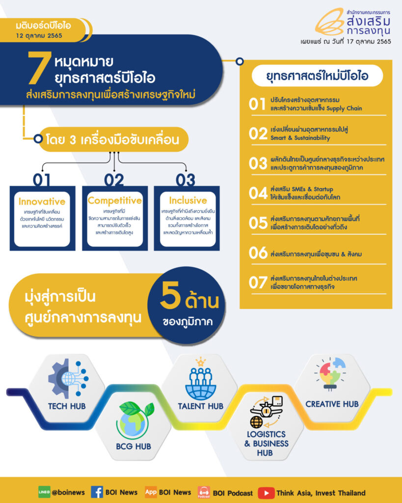 สำหรับ 7 หมุดหมายสำคัญในการส่งเสริมการลงทุนเพื่อมุ่งสู่เศรษฐกิจใหม่ และยกระดับให้ไทยเป็นศูนย์กลางการลงทุนของภูมิภาค ประกอบด้วย 1) การปรับโครงสร้างอุตสาหกรรม โดยยกระดับอุตสาหกรรมเดิมที่ไทยมีความโดดเด่น ควบคู่กับการสร้างฐานอุตสาหกรรมใหม่ที่ไทยมีศักยภาพ และสร้างความเข้มแข็งของ Supply Chain 2) เร่งเปลี่ยนผ่านอุตสาหกรรมไปสู่ Smart & Sustainability 3) ผลักดันไทยเป็นศูนย์กลางธุรกิจระหว่างประเทศและประตูการค้าการลงทุนของภูมิภาค 4) ส่งเสริม SMEs และ Startup ให้เข้มแข็งและเชื่อมต่อกับโลก 5) ส่งเสริมการลงทุนตามศักยภาพพื้นที่ เพื่อสร้างการเติบโตอย่างทั่วถึง 6) ส่งเสริมการลงทุนเพื่อพัฒนาชุมชนและสังคม และ 7) ส่งเสริมผู้ประกอบการที่มีศักยภาพให้ออกไปลงทุนในต่างประเทศ เพื่อขยายโอกาสทางธุรกิจ โดยบีไอไอจะใช้เครื่องมือสำคัญ 3 ด้าน เพื่อขับเคลื่อน 7 หมุดหมายให้บรรลุผลสำเร็จ คือ สิทธิประโยชน์ทั้งภาษีและไม่ใช่ภาษี การบริการแบบครบวงจรทั้งก่อนและหลังการลงทุน การสร้างระบบนิเวศและปรับปรุงกฎระเบียบให้เอื้อต่อการลงทุน