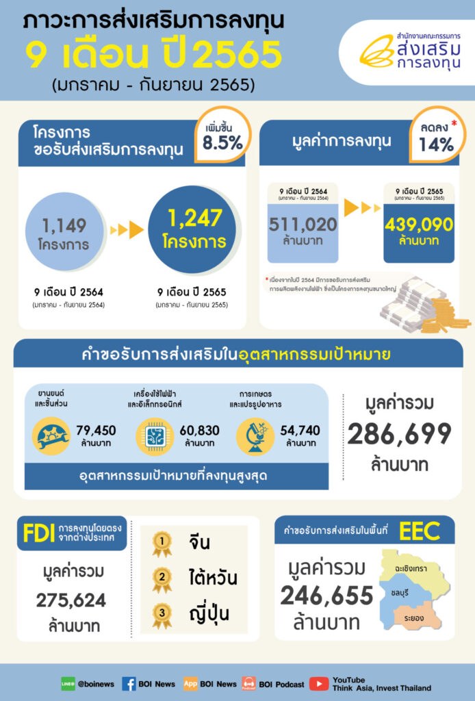 สำหรับสถิติคำขอรับการส่งเสริมการลงทุนในช่วง 9 เดือน (ม.ค.-ก.ย.) ปี 2565 มีโครงการขอรับการส่งเสริมการลงทุน 1,247 โครงการ เพิ่มขึ้นจากช่วงเดียวกันของปีก่อน ร้อยละ 8 และมูลค่ารวม 439,090 ล้านบาท ลดลงร้อยละ 14 เนื่องจากปีที่แล้ว มีโครงการขนาดใหญ่ในกิจการผลิตพลังงานไฟฟ้ายื่นขอรับการส่งเสริมหลายโครงการ มูลค่ารวมกว่า 1.5 แสนล้านบาท หากพิจารณาจากสถิติการออกบัตรส่งเสริม ซึ่งเป็นขั้นตอนที่ใกล้เคียงกับการลงทุนจริงมากที่สุด จะพบว่าในช่วง 9 เดือนที่ผ่านมา มีการออกบัตรส่งเสริม 1,101 โครงการ เพิ่มขึ้นจากช่วงเดียวกันของปีก่อน ร้อยละ 17 และมูลค่ารวม 357,552 ล้านบาท เพิ่มขึ้นร้อยละ 57 เป็นสัญญาณว่าในช่วง 1-2 ปีข้างหน้า จะมีการลงทุนเกิดขึ้นจริงมากขึ้น
