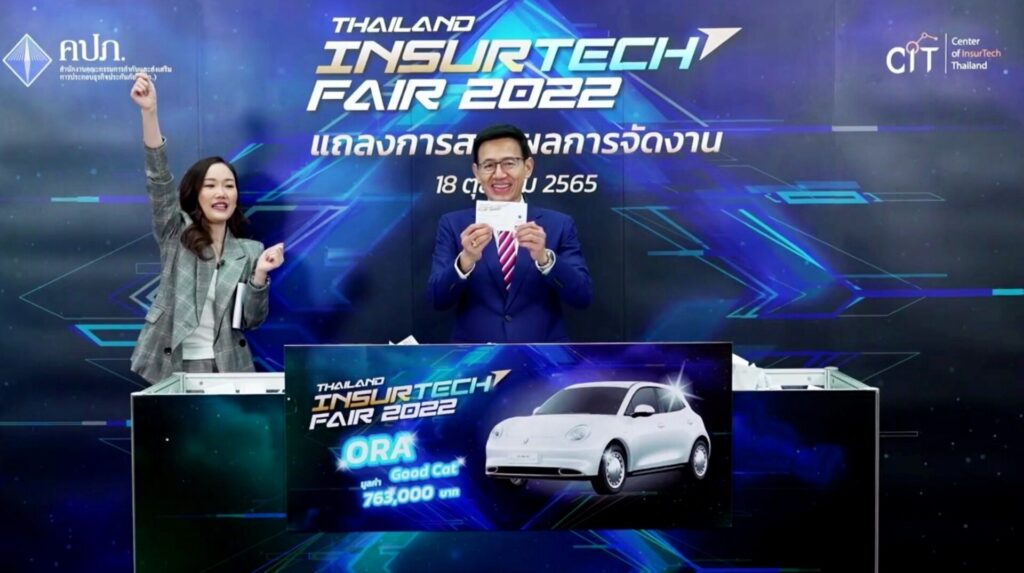 ในวันนี้ (18 ตุลาคม 2565) นอกจากจะมีการแถลงข่าวผลการจัดงาน “Thailand InsurTech Fair 2022” แล้ว ยังมีการจับรางวัลใหญ่ให้กับผู้ที่ซื้อผลิตภัณฑ์ประกันภัยภายในงาน โดยผู้โชคดีที่ได้รับรางวัลใหญ่ รถยนต์ไฟฟ้า EV – Ora Good Cat มูลค่ากว่า 763,000 บาท คือ คุณนุชรี อ่อนพร้อม ผู้ซื้อกรมธรรม์ประกันชีวิต จำนวน 1 ฉบับ