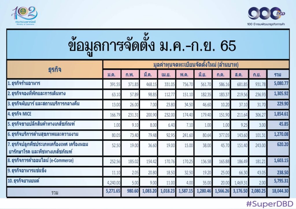 อย่างไรก็ตาม เมื่อพิจารณาจำนวนธุรกิจจัดตั้งใหม่ในกลุ่มธุรกิจดังกล่าว ช่วง 9 เดือนแรก (ม.ค. – ก.ย.) ของปี 2565 พบว่า 1) ธุรกิจร้านอาหาร มีจำนวนการจัดตั้งธุรกิจ ทั้งหมด 2,288 ราย เพิ่มขึ้นจากช่วงเวลาเดียวกันของปี 2564 ร้อยละ 59.67 2) ธุรกิจจองที่พักและการเดินทาง มีจำนวนการจัดตั้งธุรกิจทั้งหมด 722 ราย เพิ่มขึ้นจากช่วงเวลาเดียวกันของปี 2564 ถึง 261 เท่า 3) ธุรกิจผับบาร์ สถานบริการกลางคืน มีจำนวนการจัดตั้งธุรกิจ ทั้งหมด 102 ราย เพิ่มขึ้นจากช่วงเวลาเดียวกันของปี 2564 ถึง 200 เท่า และ 4) ธุรกิจ MICE มีจำนวนการจัดตั้งธุรกิจ ทั้งหมด 1,202 ราย เพิ่มขึ้นจากช่วงเวลาเดียวกันของปี 2564 ร้อยละ 10.17