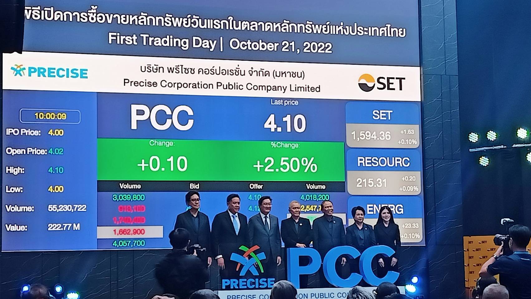 บมจ. พรีไซซ คอร์ปอเรชั่น หรือ PCC ประกอบธุรกิจผลิตและจำหน่ายอุปกรณ์ในระบบจ่ายไฟฟ้า รวมถึงผลิตและจำหน่ายกระแสไฟฟ้าจากพลังงานทดแทน เข้าซื้อขายในตลาดหลักทรัพย์แห่งประเทศไทยวันแรก ราคาเปิดที่ 4.02 บาท เพิ่มขึ้น 0.02 บาท เหนือจอง 0.5% จากราคาไอพีโอ (IPO) 4.00 บาท