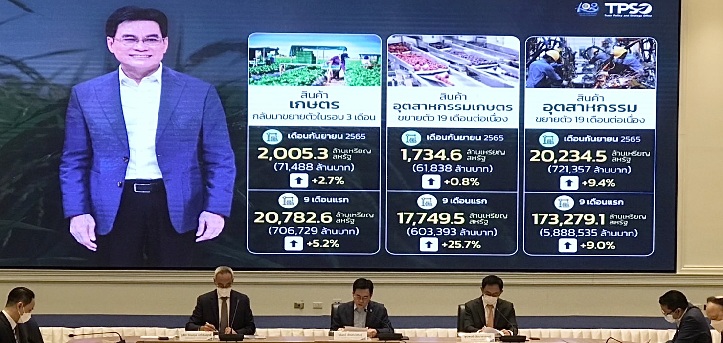 นนทบุรี 26 ต.ค.-รัฐมนตรีพาณิชย์เผยยอดตัวส่งออกเดือน ก.ย.65 ยังเติบโตได้ต่อเนื่องถึง 7.8% แม้ตัวเลขนำเข้าจะเติบโตด้วยก็ตามถึง 15.6% ทำให้ไทยขาดดุล 853 ล้านเหรียญสหรัฐ แต่มั่นใจยอดส่งออกทั้งปีโตเกินเป้าหมายแน่นอน