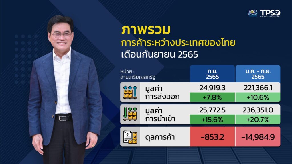 นายจุรินทร์ ลักษณวิศิษฎ์ รองนายกรัฐมนตรี และรัฐมนตรีว่าการกระทรวงพาณิชย์ เปิดเผยถึงภาวะการค้าระหว่างประเทศของไทยว่า ในเดือน ก.ย.65 มีมูลค่า 24,919 ล้านเหรียญสหรัฐ หรือประมาณ 888,371 ล้านบาทขยายตัว7.8% จากช่วงเดียวกันของปีก่อน ขณะที่ตลาดคาดว่าจะขยายตัว 4.3.-4.4% ขณะที่การนำเข้า มีมูลค่า 25,772 ล้านเหรียญสหรัฐ ขยายตัว 15.6% จากช่วงเดียวกันของปีก่อน ส่งผลให้เดือนก.ย. ไทยขาดดุลการค้า 853.2 ล้านเหรียญสหรัฐ