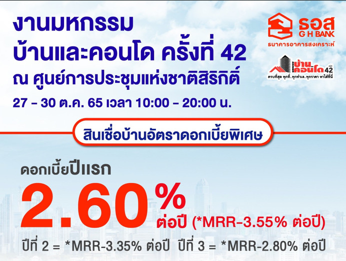 ธนาคารอาคารสงเคราะห์ (ธอส.) เอาใจประชาชนที่ต้องการมีที่อยู่อาศัยเป็นของตนเอง ด้วยการร่วมงาน “มหกรรมบ้านและคอนโด ครั้งที่ 42” นำผลิตภัณฑ์ทางการเงินของธนาคาร นำโดย สินเชื่อบ้านอัตราดอกเบี้ยต่ำ ปีที่ 1 เท่ากับMRR-3.55% (ปัจจุบันเท่ากับ 2.60%) ต่อปี เฉลี่ย 3 ปีแรกเพียง 2.917% (อัตราดอกเบี้ย MRR ของ ธอส.ในปัจจุบันเท่ากับ 6.150% ต่อปี) ผ่อนชำระนานสูงสุดถึง 40 ปี ให้กู้ครอบคลุมทุกวัตถุประสงค์หลัก อาทิ ซื้อบ้าน/คอนโดมิเนียม ปลูกสร้าง และรีไฟแนนซ์ หลักประกันในการยื่นคำขอกู้ต้องอยู่ในพื้นที่กรุงเทพฯ นนทบุรี ปทุมธานี และสมุทรปราการ จองสิทธิ์ภายในงาน ยื่นกู้ตั้งแต่วันที่ 27 ตุลาคม – 30 พฤศจิกายน 2565 อนุมัติและทำนิติกรรมภายในวันที่ 30 ธันวาคม 2565