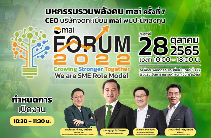 ตลาดหลักทรัพย์ เอ็ม เอ ไอ (mai) ชวนผู้ประกอบการ ผู้ลงทุน และผู้สนใจเยี่ยมชมบูธ mai ในงาน mai FORUM 2022 : มหกรรมรวมพลังคน mai ครั้งที่ 7 พบการให้คำปรึกษาสำหรับผู้ประกอบการที่ต้องการระดมทุนผ่านตลาดหลักทรัพย์แห่งประเทศไทย (SET) ตลาดหลักทรัพย์ เอ็ม เอ ไอ (mai) และตลาดหลักทรัพย์ไลฟ์เอ็กซ์เช้นจ์ (LiVEx) เพื่อสร้างโอกาสการเติบโตของธุรกิจ พร้อมคำแนะนำการเตรียมความพร้อมสำหรับ SMEs และ Startups ผ่าน LiVE Platform ศูนย์กลางการพัฒนาความรู้และศักยภาพของผู้ประกอบการที่ครอบคลุมทุกช่วงการเติบโตของธุรกิจ นอกจากนี้ ผู้ลงทุนสามารถทำความรู้จักบริษัทจดทะเบียน mai ผ่าน Company Snapshot ที่รวบรวมข้อมูลสำคัญของบริษัทจดทะเบียนแบบกระชับ อาทิ ภาพรวมธุรกิจ ผลประกอบการ แผนการดำเนินงาน เพื่อประกอบการตัดสินใจลงทุนกว่า 100 บริษัท พร้อมติดตามเมนูหุ้นเด่น mai ที่น่าสนใจ
