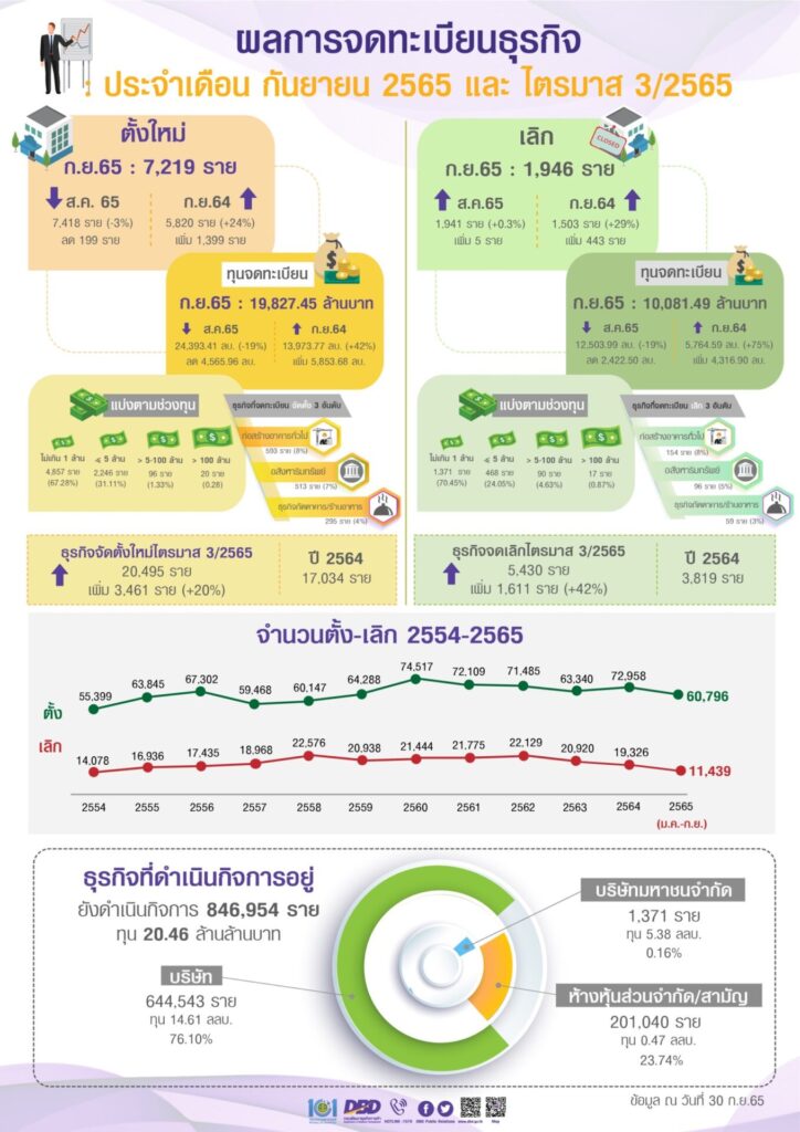 อย่างไรก็ตาม ทำให้ธุรกิจดำเนินกิจการอยู่ ณ เดือนก.ย.65 ทั่วประเทศ จำนวน 846,954 ราย มูลค่าทุน 20.46 ล้านล้านบาท โดยกรมฯได้วิเคราะห์การจดทะเบียนธุรกิจประจำเดือนก.ย.65 และไตรมาสที่ 3 ของปี 65 เป็นไปตามภาพรวมของเศรษฐกิจ ได้รับแรงสนับสนุนสำคัญจากการฟื้นตัวของเศรษฐกิจในประเทศ โดยเฉพาะภาคการท่องเที่ยวและบริการ จากการผ่อนคลายมาตรการป้องกันโรคโควิด-19 และมาตรการในด้านต่างๆ สะท้อนได้จากจำนวนนักท่องเที่ยวต่างชาติที่เดินทางเข้าประเทศในเดือนกันยายนกว่า 1.3 ล้านคน รวมทั้งการจัดกิจกรรมขนาดใหญ่หลายกิจกรรมที่ได้รับการตอบรับเข้าร่วมจากประชาชนจำนวนมาก