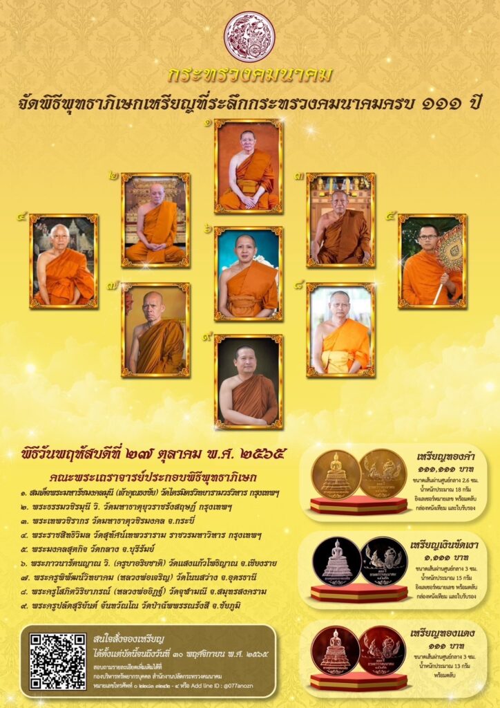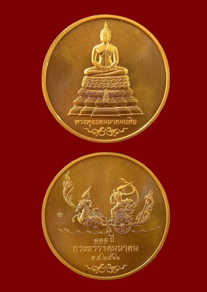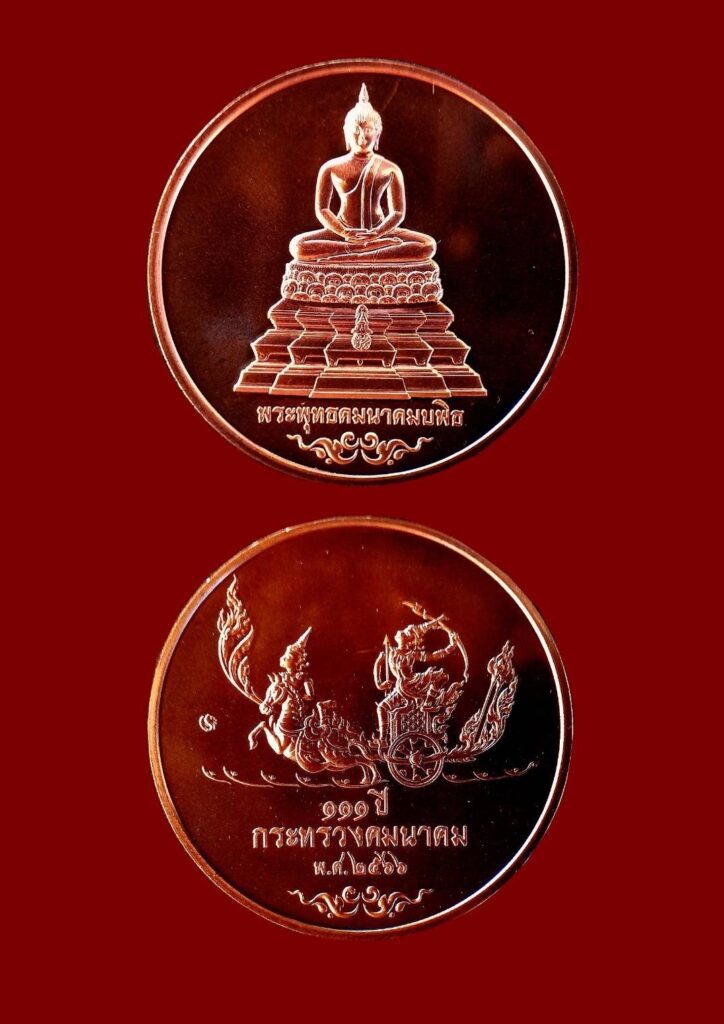 นายศักดิ์สยาม ชิดชอบ รัฐมนตรีว่าการกระทรวงคมนาคม เป็นประธานพิธีพุทธาภิเษกเหรียญที่ระลึกกระทรวงคมนาคม ครบ 111 ปี เนื่องในโอกาสที่กระทรวงคมนาคม ครบ 111 ปี ในวันที่ 1 เมษายน 2566 นายชยธรรม์พรหมศร ปลัดกระทรวงคมนาคม พร้อมด้วยผู้บริหารกระทรวงคมนาคม ข้าราชการ และเจ้าหน้าที่ร่วมพิธี ได้จัดทำเหรียญที่ระลึกกระทรวงคมนาคม ครบ 111 ปี เนื่องในโอกาสที่กระทรวงคมนาคม ครบ 111 ปี ในวันที่ 1 เมษายน 2566 โดยจำลองแบบ “พระพุทธคมนาคมบพิธ” พระพุทธรูปศักดิ์สิทธิ์ประจำกระทรวงคมนาคมมาเป็นแบบบนเหรียญ มีลักษณะเหรียญทรงกลม ลวดลายด้านหน้าเหรียญเป็นรูปพระพุทธคมนาคมบพิธและด้านหลังเหรียญเป็นรูปพระรามทรงรถ (ตรากระทรวงคมนาคม)ประกอบด้วย เหรียญ 3 ชนิด ได้แก่เหรียญทองคำ ขนาดเส้นผ่านศูนย์กลาง 2.6 ซม. น้ำหนักประมาณ 18 กรัม ยิงเลเซอร์หมายเลข พร้อมตลับ กล่องหนังเทียม และใบรับรอง ราคา 111,111 บาท