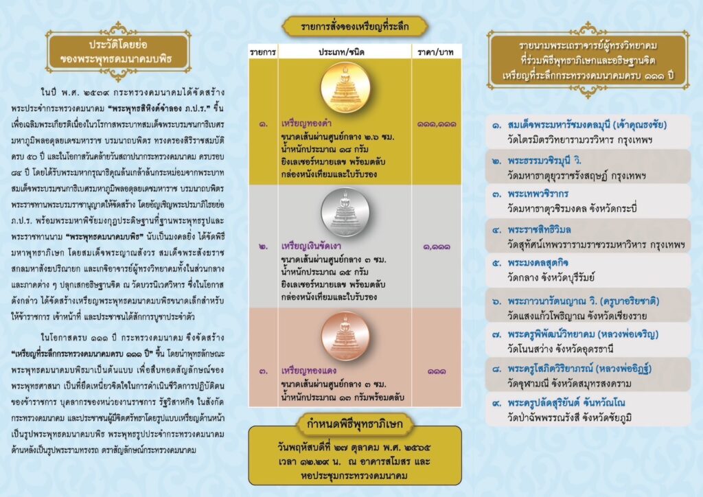 สำหรับ “พระพุทธคมนาคมบพิธ” พระพุทธรูปศักดิ์สิทธิ์ประจำกระทรวงคมนาคม ที่นำมาเป็นแบบบนเหรียญ กระทรวงคมนาคม ได้จัดสร้างขึ้นในวาระสถาปนากระทรวงคมนาคม ครบ 84 ปี เมื่อวันที่ 1 เมษายน 2539 โดยสร้างเป็นพระพุทธสิหิงค์จำลอง ภ.ป.ร. ขนาดหน้าตักประมาณ 25 นิ้ว เนื้อลำอู่แดงลงรักปิดทอง ทำพิธีเททองหล่อ เมื่อวันเสาร์ที่ 23 มีนาคม 2539 ตรงกับวันขึ้น 5 ค่ำเดือน 5 โดยสมเด็จพระญาณสังวร สมเด็จพระสังฆราช สกลมหาสังฆปริณายก ทรงกรุณาเสด็จเป็นองค์ประธานเททอง ณ โบสถ์รังสีวัดบวรนิเวศวิหาร ประกอบพิธีพุทธาภิเษก เมื่อวันอังคารที่ 19 พฤศจิกายน 2539 ณ พระอุโบสถวัดบวรนิเวศวิหาร นับเป็นโอกาสอันดีอีกครั้งที่กระทรวงคมนาคมได้จัดทำเหรียญที่ระลึกกระทรวงคมนาคม ครบ 111 ปี เพื่อสืบทอดสัญลักษณ์ของพระพุทธศาสนา เป็นที่ยึดเหนี่ยวจิตใจในการดำเนินชีวิต และการปฏิบัติตนของข้าราชการ บุคลากรของหน่วยงานราชการ รัฐวิสาหกิจในสังกัดกระทรวงคมนาคม และประชาชนผู้มีจิตศรัทธา