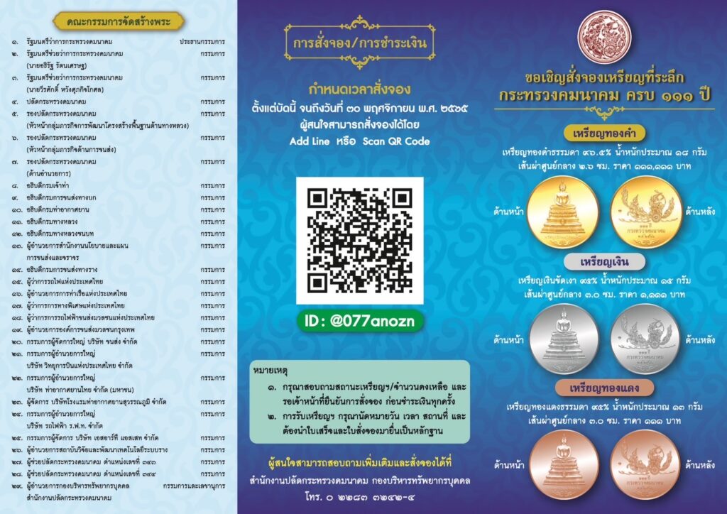 ทั้งนี้ จะนำรายได้ส่วนหนึ่งหลังหักค่าใช้จ่ายสมทบเข้ากองทุนเกี่ยวกับด้านศาสนกิจ สาธารณกุศล สวัสดิการ หรือสาธารณประโยชน์ของกระทรวงคมนาคม กระทรวงคมนาคม จึงขอเชิญชวนผู้ที่สนใจสั่งจองเหรียญที่ระลึกกระทรวงคมนาคม ครบ 111 ปี ได้ตั้งแต่บัดนี้เป็นต้นไป จนถึงวันที่ 30 พฤศจิกายน พ.ศ. 2565 ทั้งนี้ สามารถสอบถามรายละเอียดเพิ่มเติมได้ที่ กองบริหารทรัพยากรบุคคล สำนักงานปลัดกระทรวงคมนาคม หมายเลขโทรศัพท์ 0 2283 3242 – 4 หรือ Add line ID : @077anozn ได้.-สำนักข่าวไทย