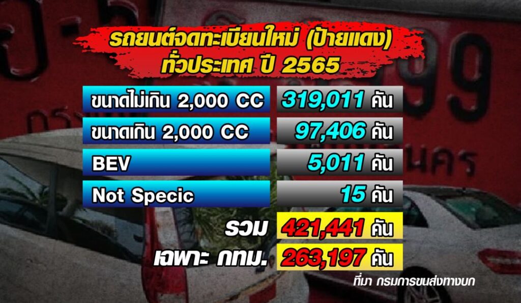 สำหรับปริมาณรถยนต์จดทะเบียนใหม่ (ป้ายแดง) ทั่วประเทศ ปี 2022 ขนาดไม่เกิน 2,000 CC มีจำนวน 319,011 คัน ขนาดเกิน 2,000 CC จำนวน 97,406 คัน BEV จำนวน 5,011 คัน Not Specific จำนวน 15 คัน รวม 421,441 คัน เฉพาะใน กทม. 263,197 คัน .-สำนักข่าวไทย