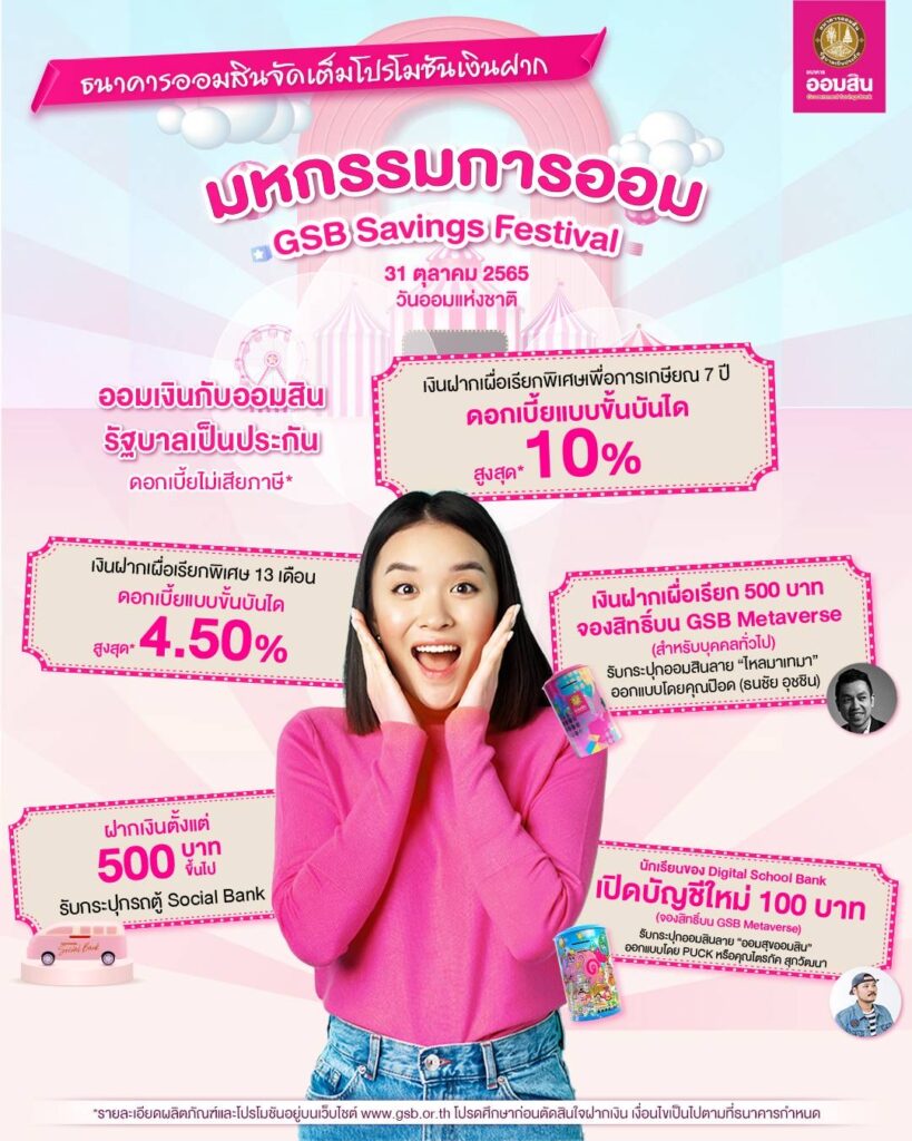 ธ.ออมสิน จึงออกนวัตกรรมเงินฝาก 2 ประเภท ได้แก่ เงินฝากเผื่อเรียกเพื่อการเกษียณ 7 ปี สำหรับเก็บออมรองรับวัยเกษียณ รับฝากเฉพาะบุคคลธรรมดา เริ่มต้นฝากขั้นต่ำ 1,000 บาท สูงสุดไม่เกิน 100,000 บาท กำหนดอัตราดอกเบี้ยแบบ Step Up จ่ายดอกเบี้ยเพิ่มขึ้นตามช่วงเวลาที่ธนาคารกำหนด สูงสุดร้อยละ 10 ต่อปี ในปีที่ 7 คิดดอกเบี้ยเฉลี่ยร้อยละ 3.21 ต่อปี (ดอกเบี้ยไม่เสียภาษี) เทียบเท่าดอกเบี้ยเงินฝากประจำร้อยละ 3.77 ต่อปี เปิดลงทะเบียนจองสิทธิ์รับฝากที่ เว็บไซต์ www.gsb.or.th หรือ Line Official : GSB Society ตั้งแต่วันที่ 31 ต.ค. เป็นต้นไปจนกว่าจะหมดวงเงิน นับเป็นเงินฝากประจำระยะยาวที่สุดในระบบ และให้ดอกเบี้ยผลตอบแทนจูงใจ ตั้งเป้าหมายเงินฝาก 5,000 ล้านบาท และพร้อมรองรับเพิ่มหากลูกค้าต้องการฝากจำนวนมาก