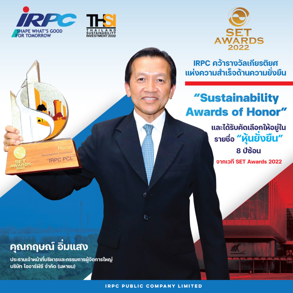 นายกฤษณ์ อิ่มแสง ประธานเจ้าหน้าที่บริหารและกรรมการผู้จัดการใหญ่ บริษัท ไออาร์พีซี จำกัด (มหาชน) หรือ IRPC รับรางวัล SET Awards ประจำปี 2565 “รางวัลเกียรติยศแห่งความสำเร็จด้านความยั่งยืน (Sustainability Awards of Honor)” จัดโดยตลาดหลักทรัพย์แห่งประเทศไทย ร่วมกับวารสารการเงินธนาคาร โดยรางวัลเกียรติยศแห่งความสำเร็จด้านความยั่งยืน (Sustainability Awards of Honor) เป็นรางวัลที่มอบให้แก่บริษัทจดทะเบียนที่มีการดำเนินธุรกิจตามแนวทางการพัฒนาอย่างยั่งยืน โดยมีการกำกับดูแลกิจการที่ดี คำนึงถึงผู้มีส่วนได้เสียอย่างรอบด้าน เพื่อให้ธุรกิจ มีการเติบโตด้านเศรษฐกิจ ควบคู่ไปกับการพัฒนาสังคมและสิ่งแวดล้อมอย่างสมดุล เพื่อเป็นแบบอย่างสำหรับบริษัทจดทะเบียนรายอื่น และส่งเสริมให้บริษัทจดทะเบียนดำเนินธุรกิจตามแนวทางความยั่งยืนต่อไป ซึ่งสะท้อนให้เห็นถึงเจตนารมณ์ของ IRPC ที่ให้ความสำคัญกับการบูรณาการความยั่งยืนในการดำเนินงาน คำนึงถึงสิ่งแวดล้อมสังคม ภายใต้หลักธรรมาภิบาล หรือ ESG (Environmental, Social and Governance)
