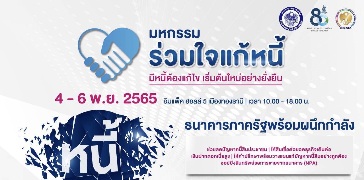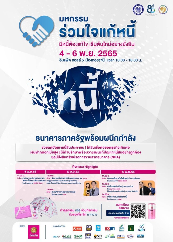 สำหรับ มหกรรมร่วมใจแก้หนี้สัญจร ครั้งที่ 1 กรุงเทพฯ ทางธนาคารออมสินได้รับมอบหน้าที่เป็นผู้จัดงานหลัก กำหนดจัดขึ้นระหว่างวันที่ 4-6 พฤศจิกายน 2565 ณ อิมแพ็ค ฮอลล์ 5 เมืองทองธานี โดยธนาคารพร้อมด้วยสถาบันการเงินของรัฐทุกแห่ง รวมถึงหน่วยงานต่าง ๆ หลายภาคส่วน ได้พร้อมใจกันนำเสนอมาตรการแก้ไขหนี้ เพื่อช่วยเหลือลูกหนี้ของสถาบันการเงินฯ แต่ละแห่ง ครอบคลุมลูกหนี้สินเชื่อประเภทต่าง ๆ อาทิ สินเชื่อบุคคล สินเชื่อบ้าน สินเชื่อธุรกิจสินเชื่อภาคการเกษตร นาโนไฟแนนซ์ รวมถึงลูกหนี้บัตรเครดิต ฯลฯ ตลอดจนบริการให้คำปรึกษาแก้ปัญหาหนี้อย่างยั่งยืน โดยผู้ที่สนใจสามารถลงทะเบียนได้ที่ https://ln15.gsb.or.th/WEB-DEBT/ เพื่อแจ้งความประสงค์มาติดต่อขอแก้ไขหนี้ พร้อมรับสิทธิพิเศษอื่น ๆ ได้ตลอดงานทั้ง 3 วัน