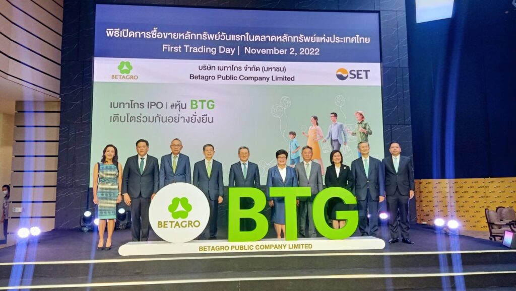 บมจ. เบทาโกร หรือ BTG เข้าจดทะเบียนและเริ่มซื้อขายในตลาดหลักทรัพย์ฯ ในกลุ่มเกษตรและอุตสาหกรรมอาหารหมวดอาหารและเครื่องดื่ม วันนี่เป็นวันแรก ราคาเปิดตลาดอยู่ที่ 39.75 บาท ลดลง 0.25 บาท ต่ำจอง 0.62 % จากราคาไอพีโอ (IPO) ที่ 40.00 บาท