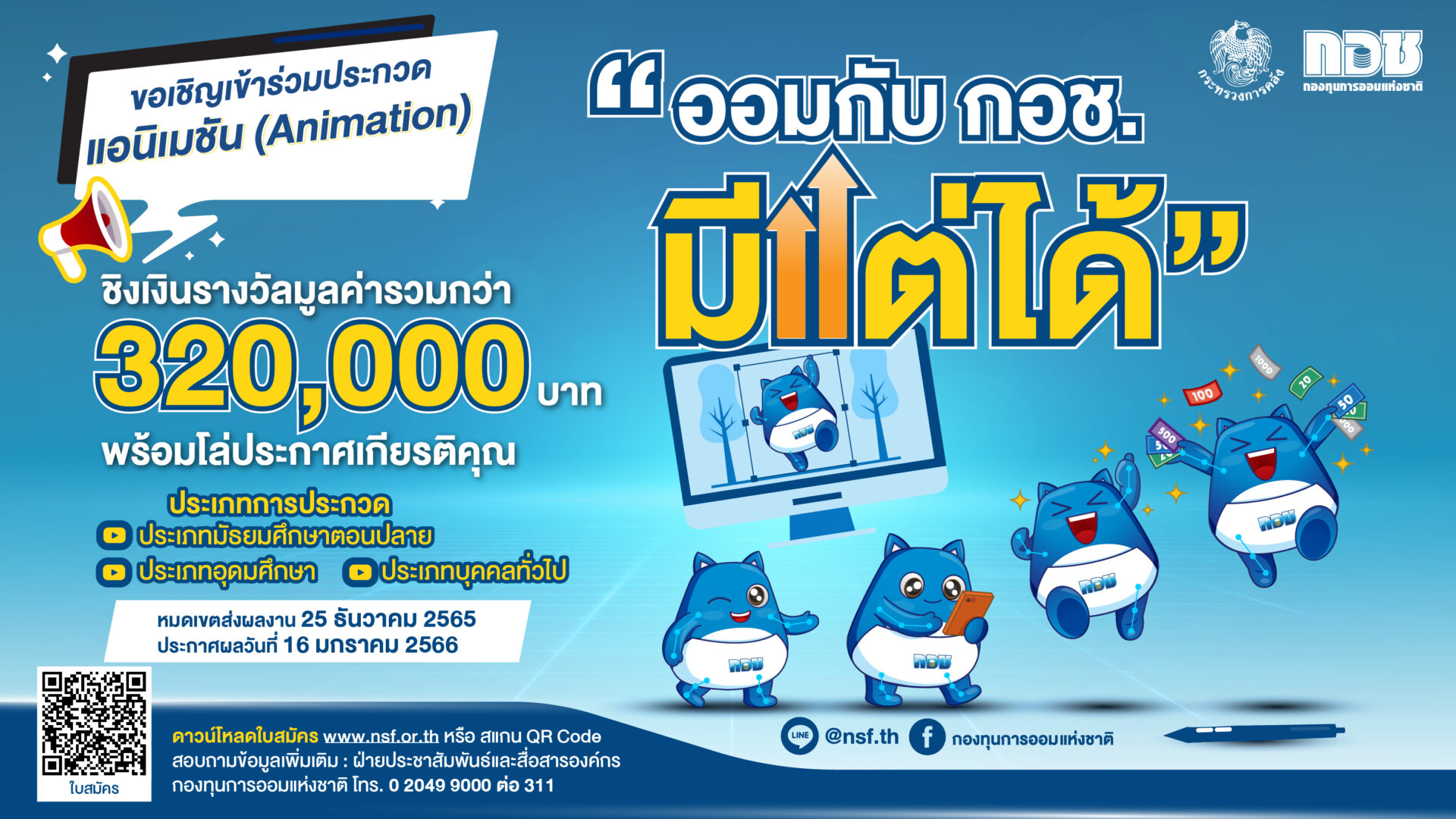 3 พ.ย. – กองทุนการออมแห่งชาติ หรือ กอช. ชวนเยาวชนและประชาชน ส่งผลงานเข้าประกวดแอนิเมชัน (Animation) หัวข้อ “ออมกับ กอช. มีแต่ได้” ชิงเงินรางวัล มูลค่ารวมกว่า 320,000 บาท พร้อมรับโล่และใบประกาศเกียรติคุณ ผู้ที่สนใจส่งผลงานเข้าร่วมประกวด ได้ถึงวันที่ 25 ธันวาคม 2565 ศึกษารายละเอียดเพิ่มเติมได้ที่เว็บไซต์ กอช. หรือ เฟซบุ๊ก กอช. สอบถามข้อมูลเพิ่มเติม สายด่วนเงินออม โทร. 02-049-9000