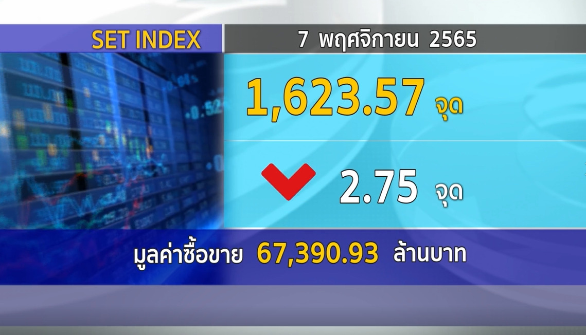 กทม. 7 พ.ย.-ตลาดหลักทรัพย์ ปิดวันนี้ที่ระดับ 1,623.57 จุด ลดลง 2.75 จุด (-0.17%) มูลค่าการซื้อขาย 67,390.93 ล้านบาท