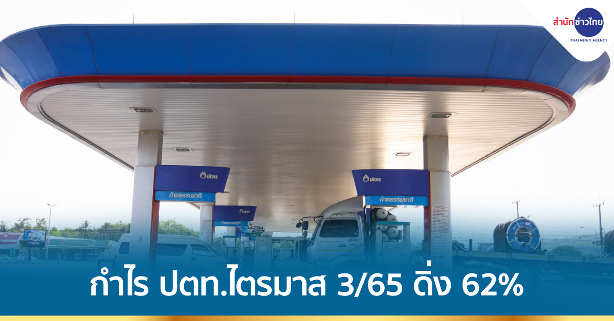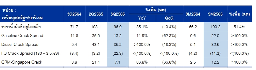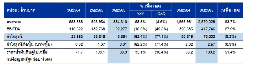สำหรับกำไรสุทธิของ ปตท. ในไตรมาส 3/2565 อยู่ที่ 8,884 ล้านบาท ลดลง 62.4% จากช่วงเดียวกันของปีที่แล้วตาม EBITDA ที่ลดลง ประกอบกับมีขาดทุนจากอัตราแลกเปลี่ยนเพิ่มขึ้น แม้ว่ามีกำไรจากตราสารอนุพันธ์เพิ่มขึ้น อย่างไรก็ดี มีการรับรู้ขาดทุนจากรายการที่ไม่ได้เกิดขึ้นประจำสุทธิภาษีตามสัดส่วนของ ปตท. เพิ่มขึ้น โดยหลักจากการด้อยค่าสินทรัพย์ที่ถือไว้ เพื่อขายจาก PTTEP Brazil Investments in Oil and Gas Exploration and Production Limitada (PTTEP BL) ของ บริษัท ปตท.สารวจและผลิตปิโตรเลียม จากัด (มหาชน) (PTTEP) ประมาณ 2,300 ล้านบาท และการจ่ายเงินสนับสนุนเข้ากองทุนน้ำมันเชื้อเพลิงช่วงสถานการณ์วิกฤติในเดือนกันยายน 2565 จานวน 1,000 ล้านบาท ระยะเวลา 3 เดือน ของ ปตท. โดยเริ่มสนับสนุนตั้งแต่เดือนกันยายน 2565 สุทธิกับการรับรู้ส่วนลดจากปริมาณที่ผู้ผลิตส่งได้ไม่ถึงปริมาณตามสัญญา (Shortfall) ประมาณ 900 ล้านบาท ของ ปตท. และรับรู้ขาดทุนจากรายการที่ไม่ได้เกิดขึ้นประจำสุทธิภาษีตามสัดส่วนของ ปตท. โดยหลักจากการตัดจำหน่ายอะไหล่เสื่อมสภาพประมาณ 700 ล้านบาทของ ปตท.