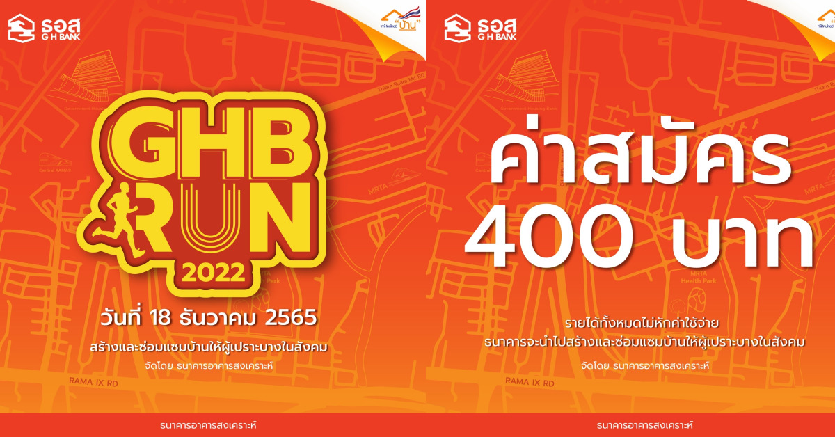 นายฉัตรชัย ศิริไล กรรมการผู้จัดการธนาคารอาคารสงเคราะห์ (ธอส.) เปิดเผยว่า เพื่อเป็นการส่งเสริมให้คนไทยหันมาออกกำลังกายเพื่อสุขภาพที่ดี พร้อมกับได้มีส่วนร่วมในการสร้างความมั่นคงทางด้านที่อยู่อาศัยให้กับกลุ่มผู้เปราะบางในสังคมไทย เพื่อคุณภาพชีวิตที่ดียิ่งขึ้น ธอส. สถาบันการเงินเฉพาะกิจของรัฐที่มีพันธกิจ “ทำให้คนไทยมีบ้าน” จึงได้จัดกิจกรรมเดิน-วิ่ง “GHB RUN 2022” ในวันอาทิตย์ที่ 18 ธันวาคม 2565 ชิงเงินรางวัลมูลค่ารวมสูงถึง 340,000 บาท นอกจากนี้ธนาคารจะนำรายได้จากค่าสมัครของผู้เข้าร่วมกิจกรรมทั้งหมดโดยไม่หักค่าใช้จ่ายรายละ 400 บาท ไปสร้างและซ่อมแซมที่อยู่อาศัยให้กับกลุ่มผู้เปราะบางในสังคม ได้อยู่อาศัยภายในบ้านที่มีคุณภาพและสภาพแวดล้อมเหมาะสมกับการดำเนินชีวิตมากยิ่งขึ้น โดยแบ่งระยะการวิ่งเป็น 2 ประเภท คือ ประเภท Fun run ระยะ 5 กิโลเมตร และ Mini marathon ระยะ 10 กิโลเมตร ขณะที่การแข่งขันและเงินรางวัลประเภท Mini Marathon แบ่งออกเป็น 2 ประเภทรางวัล ประกอบด้วย
